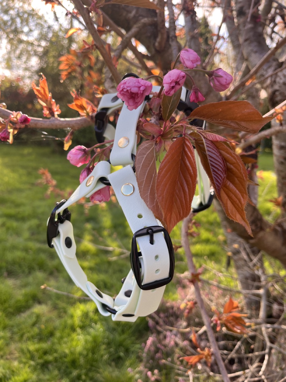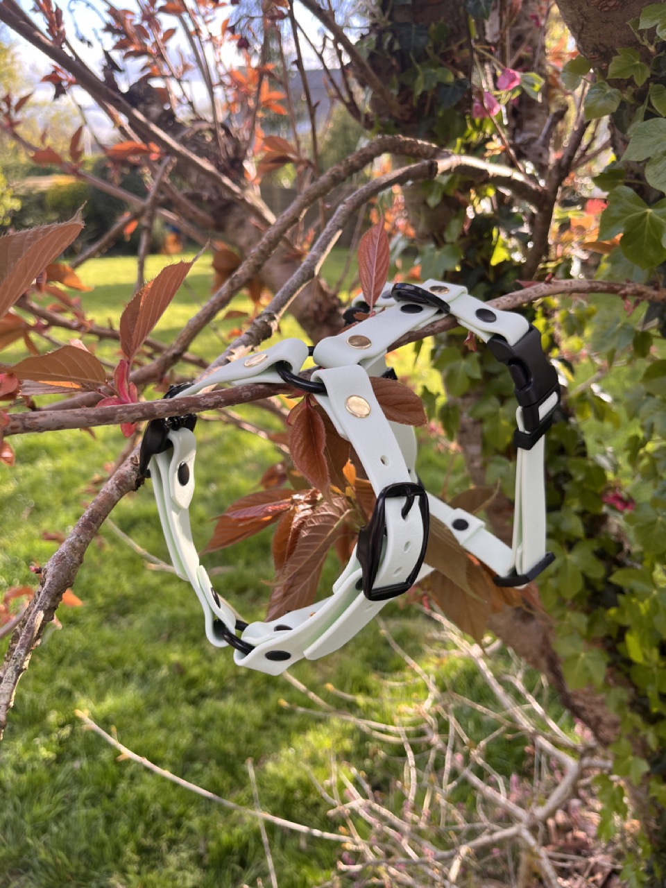 | Quincaillerie | Anneau acier noir mat, Anneau triangulaire en alliage de zinc, Boucle collier en alliage de zinc noir mat, Clip à ouverture rapide en plastique Duraflex, Passant en acétal, Rivet en acier chrome noir mat, Rivet signature en acier laitonné |