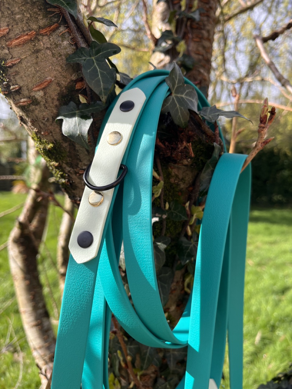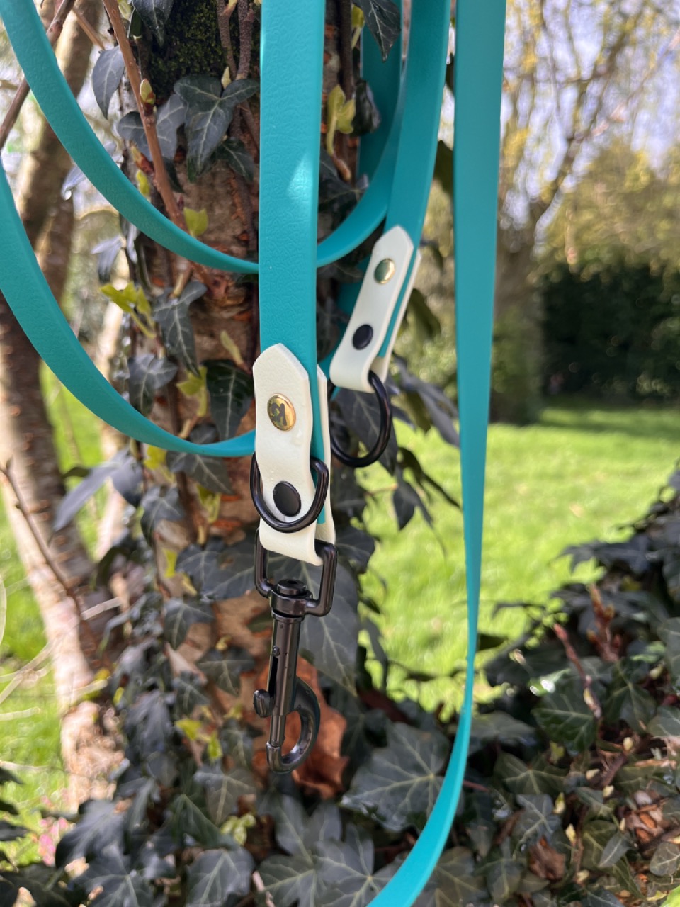 • Premier anneau, situé près du mousqueton (côté chien) : idéal pour accrocher un accessoire comme une médaille, un tracker ou une petite poignée.
