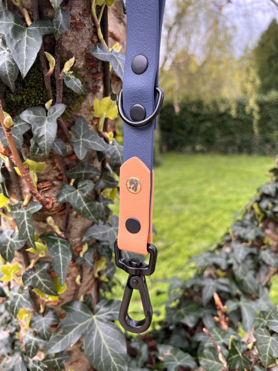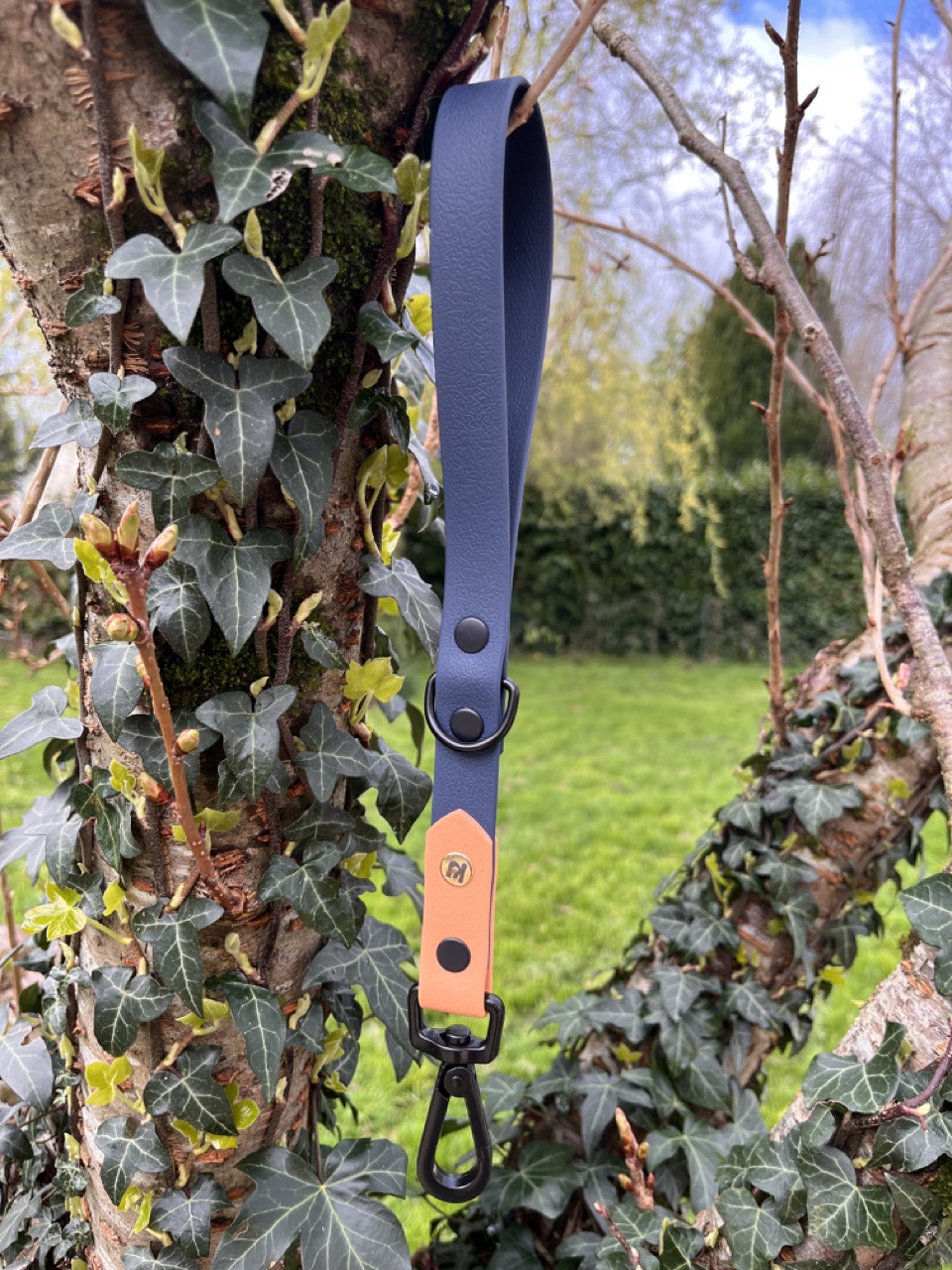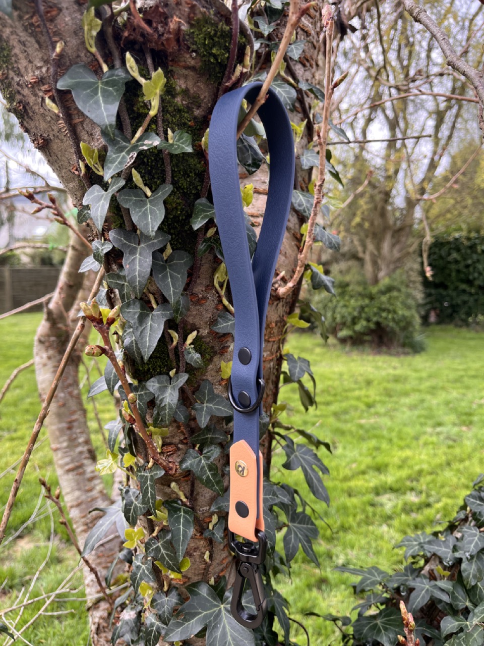 Poignée pour chien artisanale, résistante et étanche, alliant confort de prise en main, solidité et finitions élégantes avec son rivet doré signature.