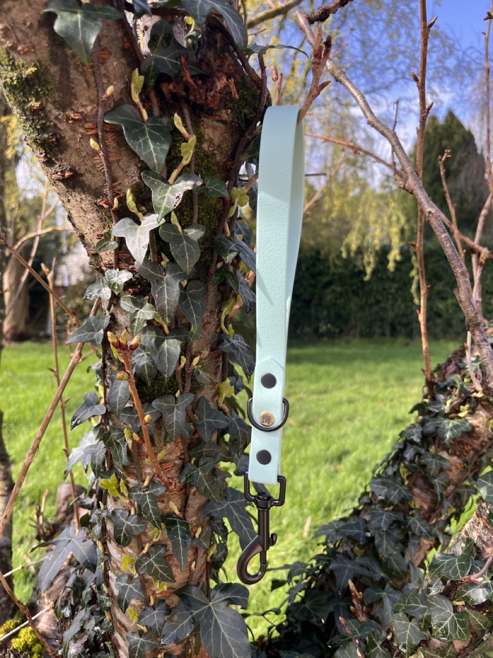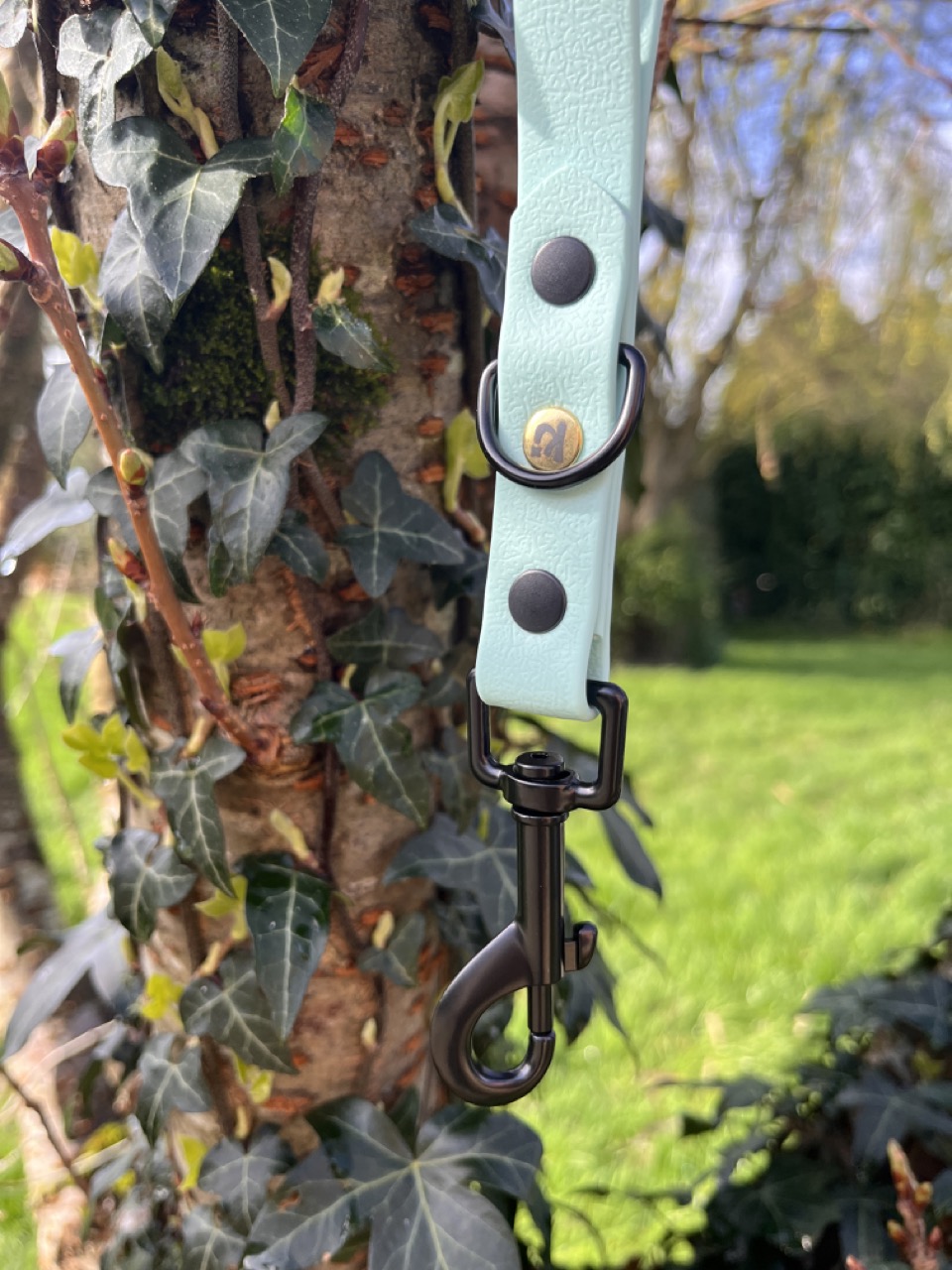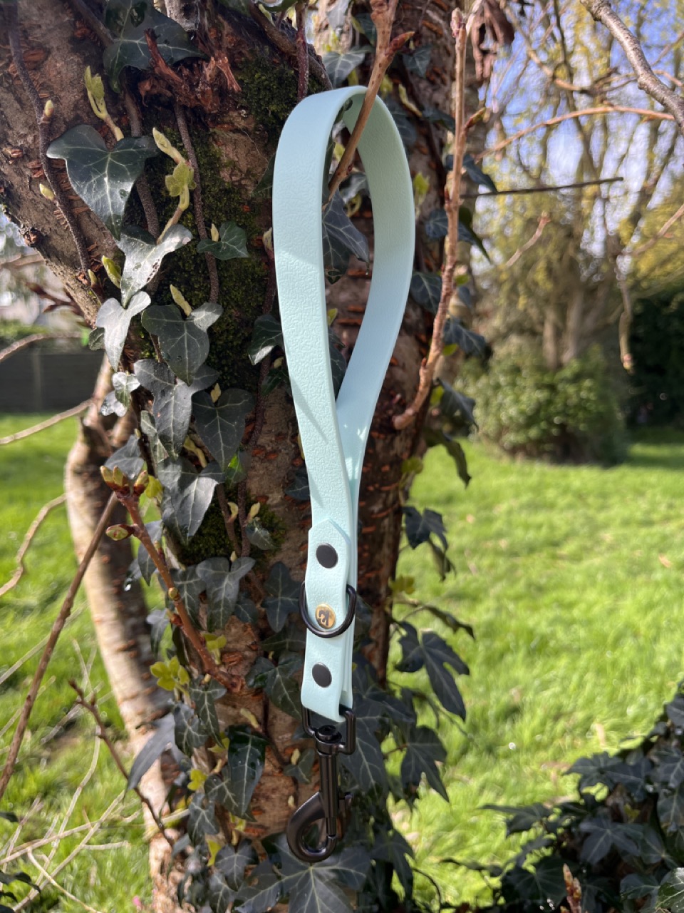 Poignée pour chien artisanale, résistante et étanche, alliant confort de prise en main, solidité et finitions élégantes avec son rivet doré signature.