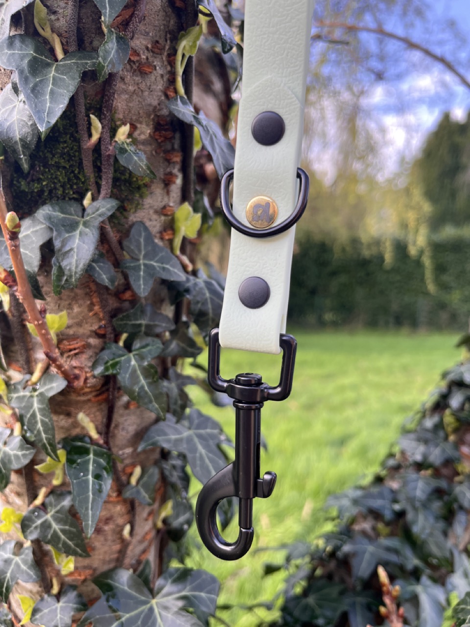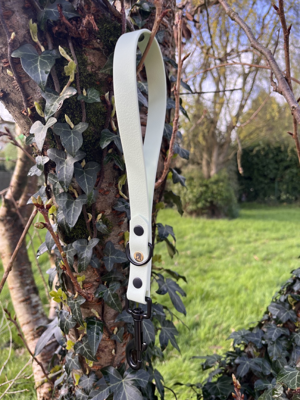 Poignée pour chien artisanale, résistante et étanche, alliant confort de prise en main, solidité et finitions élégantes avec son rivet doré signature.