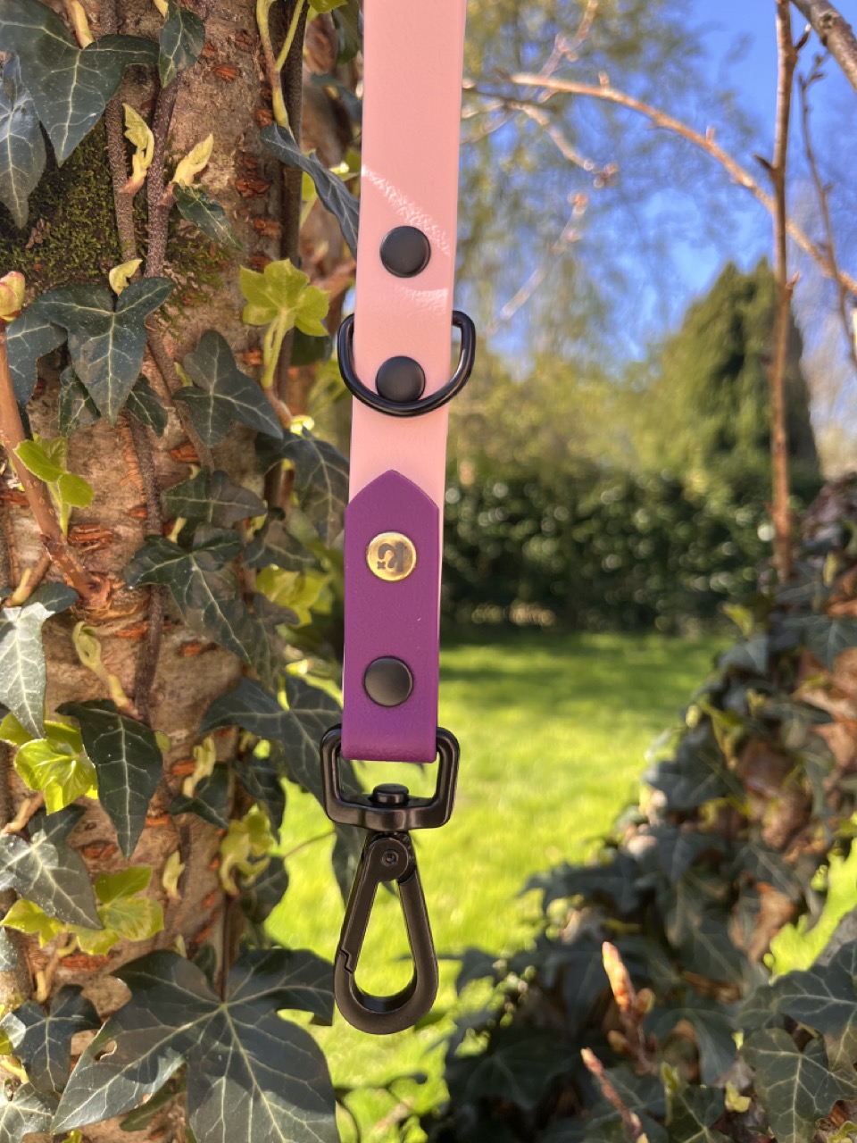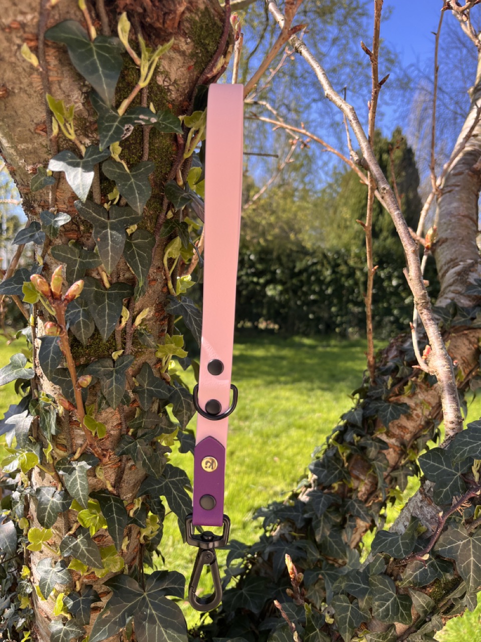 Poignée pour chien artisanale, résistante et étanche, alliant confort de prise en main, solidité et finitions élégantes avec son rivet doré signature.